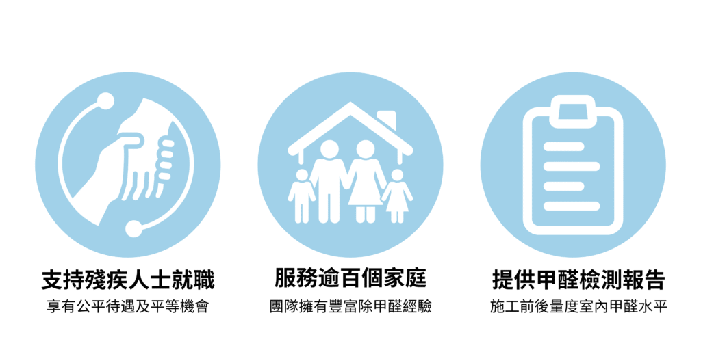 我們積極推動傷健共融,致力為殘疾及失聰人士提供就業機會,並聘用他們參與專業除甲醛工作。我們相信每個人都有獨特價值,通過提供專業培訓及適切的工作環境,讓這些員工能發揮潛能,打破障礙,讓殘疾及失聰人士在職場上獲得平等機會,共同建設一個多元共融的社會。